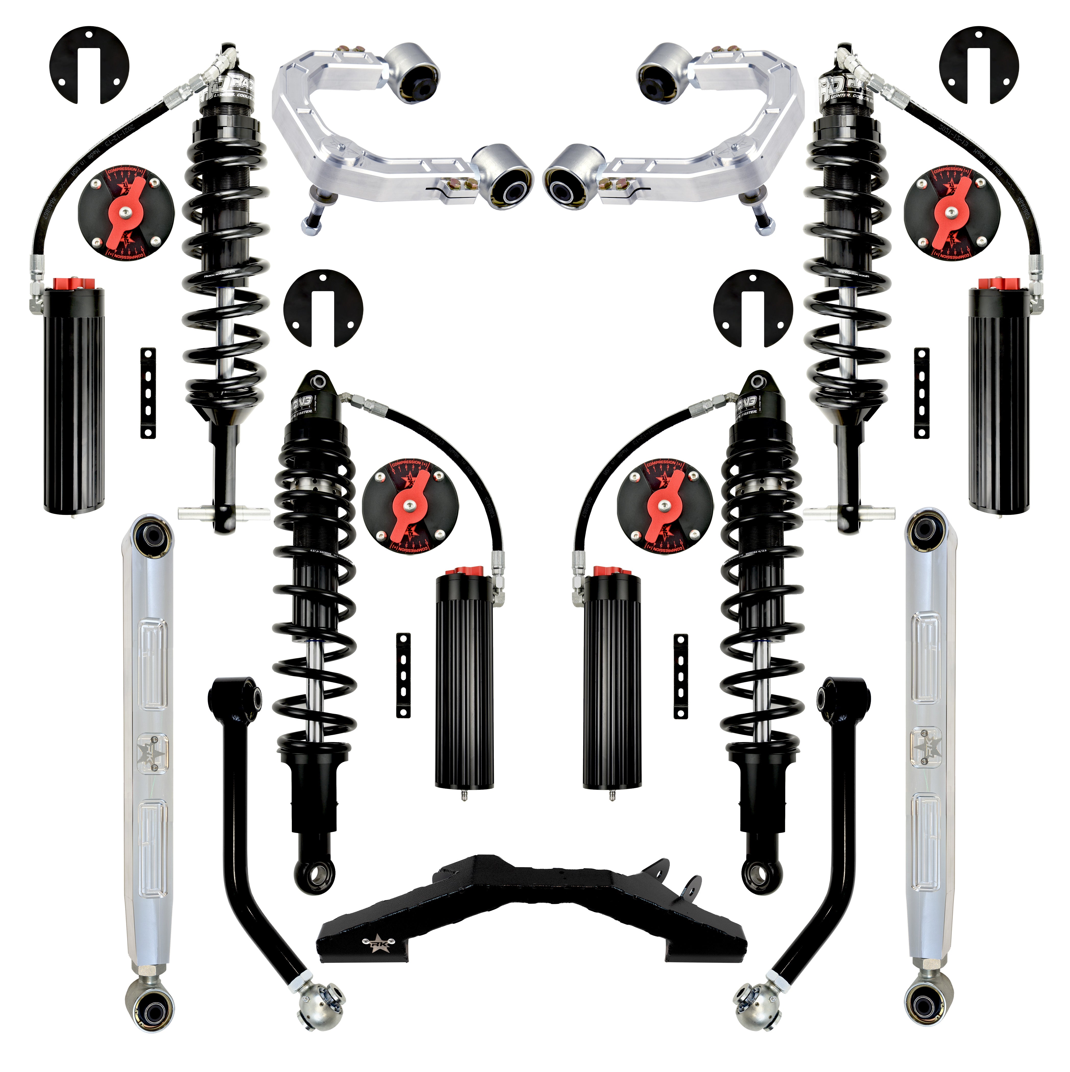 The Rock Krawler 3" Pro-X Elite System Stage 2 is the ultimate suspension upgrade for 6th Gen Ford Bronco owners seeking superior performance. Designed for those looking to push their Bronco to new limits, this system provides adjustable lift heights from 2" to 3" for optimal fitment with 35"-37" tires on factory fenders. Featuring a triangulated 4-link rear design for unmatched articulation and eliminating suspension bind, this system enhances both on-road ride comfort and off-road capabilities. With components such as RRD 2.625 all-aluminum remote reservoir coil-overs, adjustable billet aluminum A arms, and a rear triangulated 4-link conversion, it delivers superior handling, durability, and performance. Rock Krawler’s innovative multi-rate coil-over coils and FAST CD adjusters allow owners to precisely fine-tune their suspension for their driving preferences. This system offers a 30% increase in suspension travel and shock dampening, ensuring your Bronco is ready for any terrain.