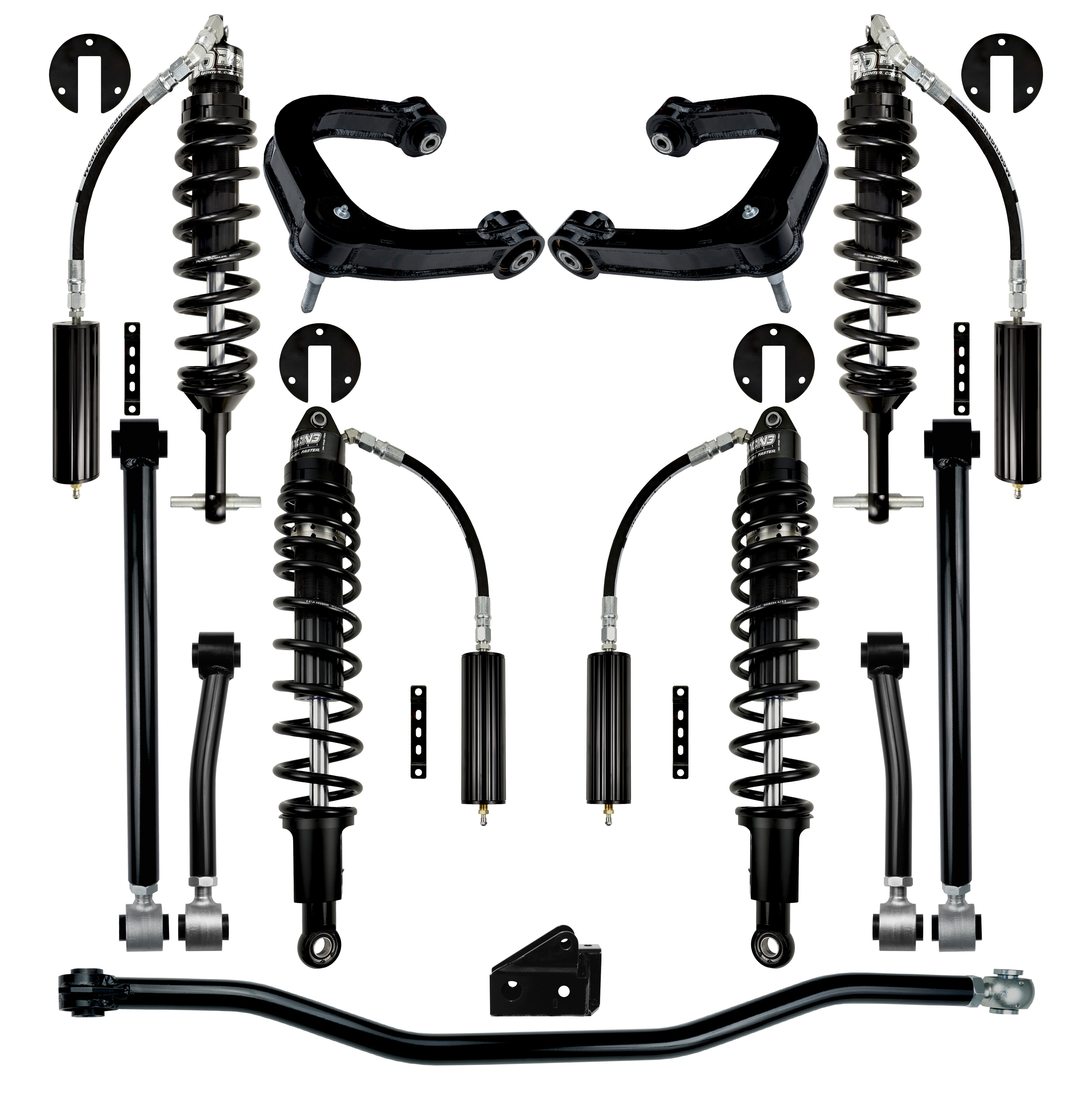 The Rock Krawler 3" X Factor System Stage 1 is the ultimate suspension upgrade for 6th Gen Ford Bronco owners looking to improve their vehicle's off-road and street performance. With adjustable lift heights from 2" to 3", this system is perfect for 35" to 37" tires while maintaining the factory fenders. It replaces the weak factory components with the strongest parts available on the market. Featuring RRD 2.625 remote reservoir coil-overs and multi-rate coils, this system enhances ride quality, handling, and performance on the trails and pavement. With 30% more wheel travel and improved shock dampening, the system provides superior performance, durability, and adjustability. The anodized aluminum bodies resist rust and corrosion, ensuring long-lasting durability. Fabricated upper A arms, rear control arms, and a bomb-proof rear track bar complete the package for maximum off-road articulation, stability, and strength.