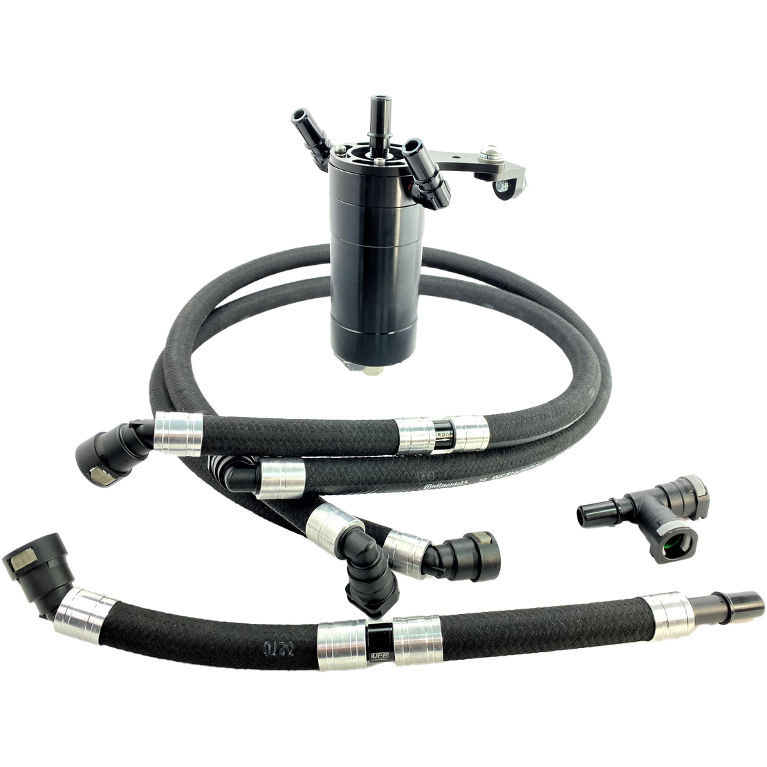 UPR's Dual Valve Plug N Play catch can kit is the perfect fit for your 2021, 2022, 2023, or 2024 Ford F150 2.7L Ecoboost engine bay, with its incredibly efficient, space-saving design and outstanding looks. UPR went the extra step to make certain you get the best quality components. UPR's Dual Valve Catch can adds a third hose that will connect to the air intake tube by installing their exclusive Quick Tap Plug N Play fitting. When under boost, the wide open throttle hose will utilize the high velocity air being pulled into the turbo through the air box tube to increase air being pulled through the catch can. The advantage is crankcase evacuation throughout the RPM range! This catch can kit employs continental braided hose and billet hose ends to give you the strongest and best performing setup possible. There's no cheap, stock lines here that have been cut and spliced on. This catch can features the UPR Plug N Play Catch Can fittings too. So you can empty the canister without ever having to remove the intake cover or catch can lines from your F150's engine. UPR has hundreds of hours testing with their 4 Stage Oil Separator to support the claims and its results will exceed your expectations. UPR even doubles the size of the oil containment chamber. The design of this unit is more along the lines of a true engineer and sets itself apart from other units that have side by inlets and outlets with screen rolled up and shoved in them. The 4 chamber technology in UPR catch cans captures and filters all the oil vapor and trash from getting into your F150's air intake tract. That's the most important reason to purchase a catch can! Constructed from domestic T-6 6061 aluminum bar stock and finished off using only the best Diamond cutters, this kit will surely exceed your expectations of what a superior product should fit and look like. UPR is the largest aftermarket catch can manufacturer in the United States. They are continually improving their designs to stay ahead of the competition and give you the cutting edge technology of tomorrow today. UPR is so confident that they offer an unconditional warranty on their products to let you know you can always count on UPR Products.