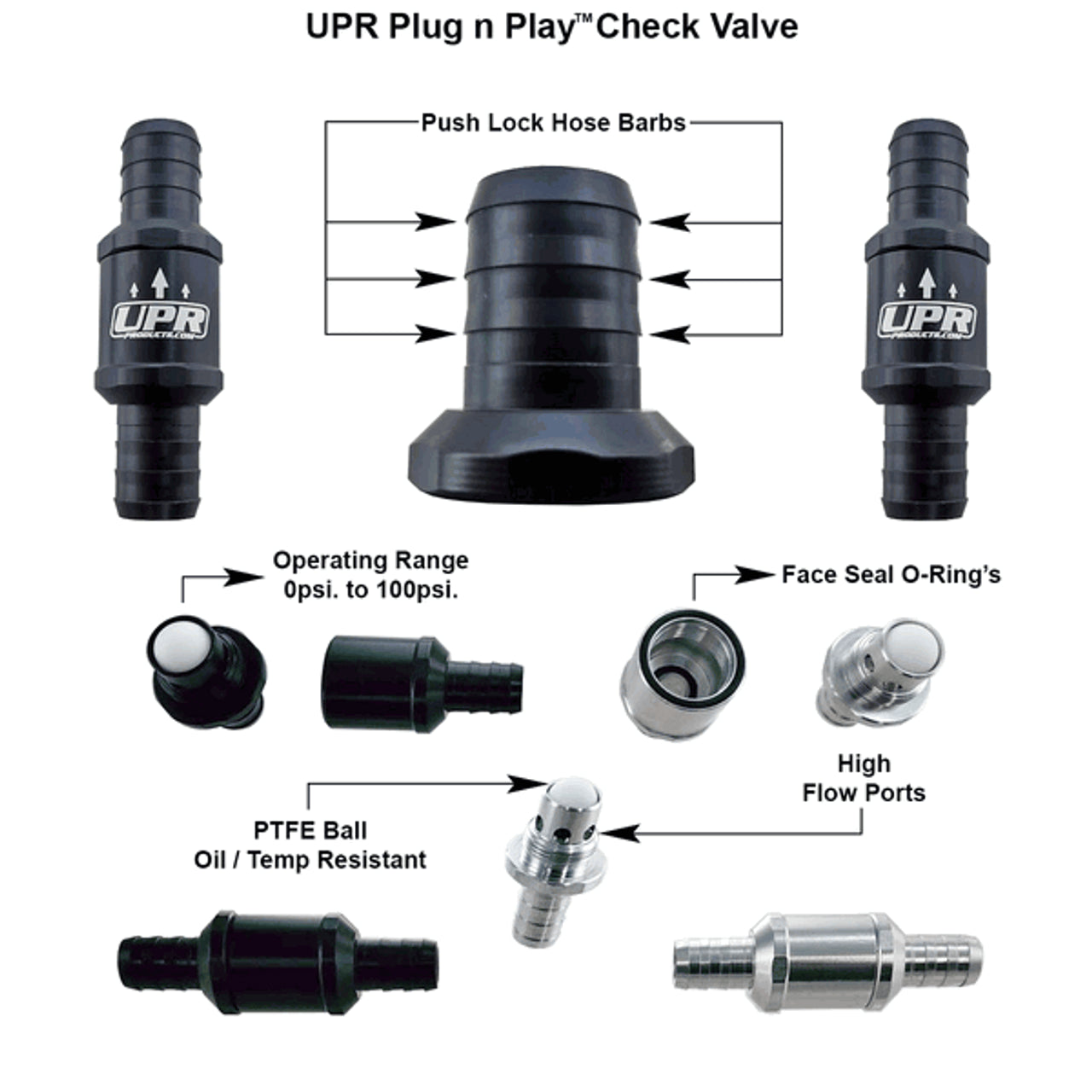 Complementing it is the UPR Billet Pro Series Check Valve 5044-03, designed for larger 17mm (5/8") hose routing. This larger-diameter valve mirrors the performance and construction quality of the 5044-02, incorporating Ultra-Bite locking barbs, a corrosion-resistant polymer ball, and the same 0 PSI cracking pressure for maximized PCV efficiency. Together, these two valves provide complete coverage for dual-size PCV setups, custom catch-can systems, or builds requiring multiple hose diameters while maintaining flawless one-way flow control under vacuum or boost.